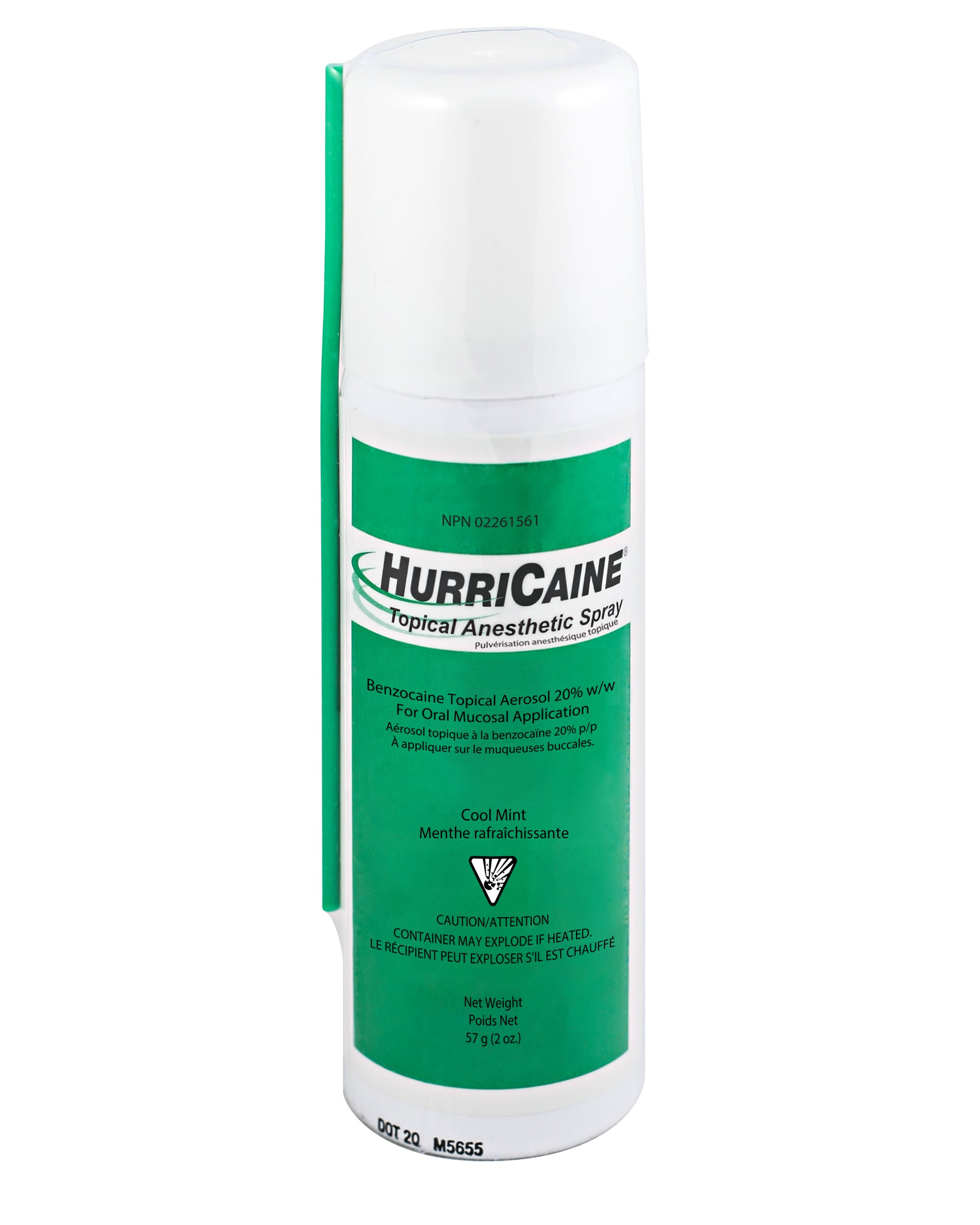 HurriCaine Topical Anesthetic, containing 20% Benzocaine, is effective, safe, and fast-acting. HurriCaine provides temporary relief of occasional minor irritation and pain associated with sore mouth and throat, canker sores, minor dental procedures, and minor injury of the mouth and gums.