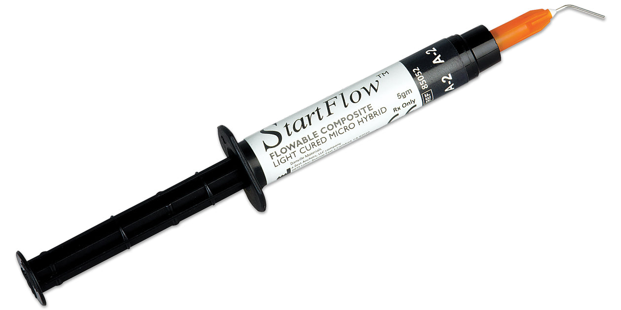 StartFlow is a low viscosity flowable composite indicated for small fillings, conservative restorations, and as a cavity liner. Its submicron particle size gives superior polishability and resistance to staining. The composite offers industry standard shade match, medium radiopacity, 0.7 micron filler size, and is non-sticky.